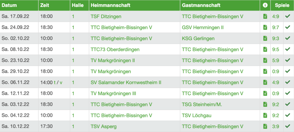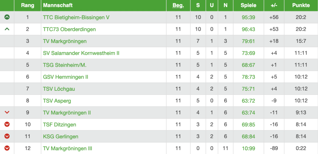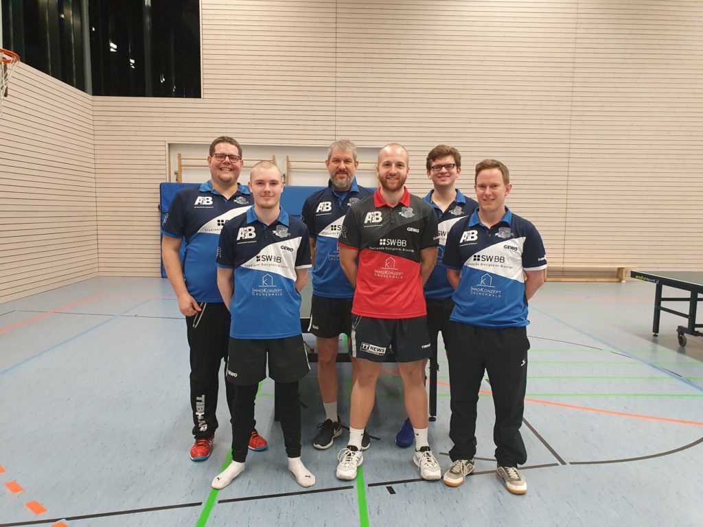 Darauf folgte das Topspiel gegen Oberderdingen. Hier spielten wir in der kleinen und eiskalten Halle in Oberderdingen, wo gerade so zwei Tische reinpassen. Wir starteten mit 0:3 Doppel und Dennis Strobel mit Stefan-Dörr-Trikot in die Partie. Der Rückstand konnte nicht mehr aufgeholt werden, sodass am Ende eine 5:9 Niederlage feststand. Es folgte ein 9:5-Sieg gegen Markgröningen 2, wobei sich die Herren V nicht gerade mit Ruhm bekleckerte (es gab allein sieben 5-Satz-Spiele). Bezeichnend für die Partie war das Match zwischen de Frenne und Immler: De Frenne gewann nach 0:2 Rückstand und mehreren Matchbällen von Immler dank den merkwürdigen Mateo-Rettungsbällen noch im Fünften. Nachdem die Herren V gegen Markgröningen 2 sehr wackelig auftrat, besiegte die Herren V die Woche darauf Markgröningen 1 (die zu der Zeit Tabellenführer waren) einfach mal mit 9:0. Durchweg gute Leistungen zogen sich durch die Partie und es gab einen Tim Janßen, der in den ersten zwei Sätzen gar kein Plan gegen Böttcher hatte, aber dann (aus reinster Verzweiflung heraus) das Spiel noch drehte.