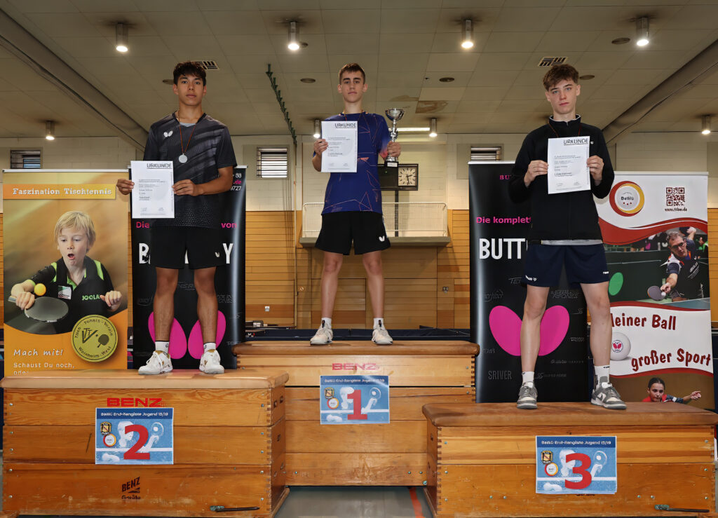 So kam es am vergangenen Wochenende in Weinheim zum finalen Showdown um die Qualifikation zur Deutschen Rangliste. Nickel ging bei den Jungen U15 Top 16 an den Start, während Mähnert und Hübner bei den Jungen U19 Top 12 um den Sieg kämpften. In einem unglaublich ausgeglichenen Feld der Jungen U19 erspielte sich Mähnert einen tollen dritten Platz und rehabilitierte sich so auch für seinen neunten Platz in Beilstein. In vielen packenden Spielen verhinderten zwei im Nachhinein unnötige Niederlagen gegen Nils Wolf (SV Sillenbuch) und Hannes Neukirchner (VSV Büchig) gar den Sprung auf den zweiten Platz. Trotzdem überzeugte Mähnert mit tollen Siegen – unter anderem gegen den Topgesetzten Mathis Braunwarth (SSV Ulm 1846). Hübner erspielte sich am Ende zwei Siege und landete auf dem vorletzten Platz. Auch hier verhinderten zwei denkbare knappe Niederlagen trotz hoher Führung im Entscheidungssatz gegen Neukirchner und Matteo Loss (SV Plüderhausen) eine bessere Platzierung. Für Nickel ging es zunächst in der Vorrundengruppe A um die Qualifikation der Plätze eins bis acht oder neun bis sechzehn. Nach drei Siegen zum Start folgten unglücklicherweise vier Niederlagen. Darunter auch zwei im Entscheidungssatz nach 2:1 Satzführung gegen Luca Xu (Sportbund Stuttgart) beziehungsweise 2:0 Satzführung gegen Noah Ziegelmeier (TTC Renchen). Damit rutschte er noch in die Ausspielung der hinteren Pläte. Dort erspielte er sich zwei weitere Siege bei zwei Niederlagen, was am Ende den zwölften Platz in der Endabrechnung einbrachte. „Lasse hat ein gutes Turnier gespielt. Aber es sind auch einige Dinge offengelegt worden, an denen er arbeiten muss. Lars war etwas unglücklich, während Fynn seine wechselhaften Auftritte leider wieder bestätigt hat“ bilanziert Matthias Grünenwald das Erlebte.