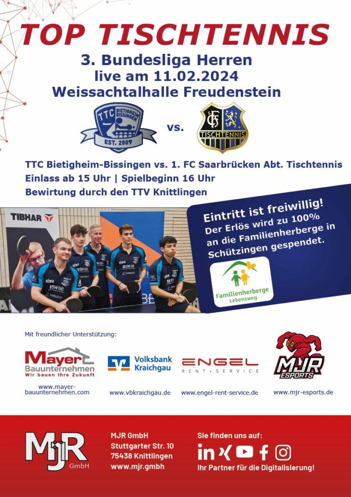 Um 16:00 Uhr ist Spielbeginn für die Partie unter der Schirmherrschaft des TTC-Sponsors MJR GmbH, Einlass ist ab 15:00 Uhr. Für die Bewirtung sorgt der Tischtennisverein Knittlingen. Der Eintritt ist auf freiwilliger Basis und kommt in Gänze der Familienherberge Schützingen zugute.