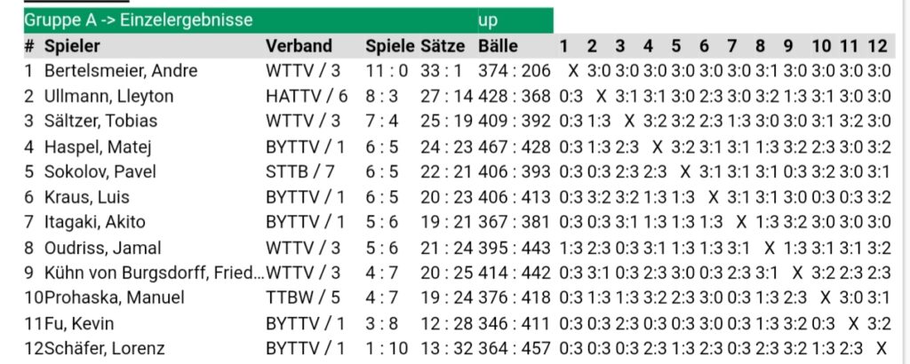 Holprig verlief der Start für Matej am Samstag mit einer 1:3-Auftaktniederlage gegen Lleyton Ullmann (Sasel), dem allerdings ein 3:0-Sieg gegen Akito Igataki (Effeltrich) folgte. „Das war sicherlich mein bestes Spiel im Turnier“, so Matej zur eigenen Leistung. Um postwendend ein souveränes 3:0 über Kevin Fu (München) folgen zu lassen. Erst Tobias Sältzer (Düsseldorf) stoppte seinen Siegeszug. Im Nachgang eine vermeidbare Niederlage. Danach war Matej vollends im Turnier angekommen, mit Siegen über Lorenz Schäfer (3:2, Kist), Luis Kraus (3:1, Kolbermoor) und Pavel Sokolov (3:2, Saarbrücken) beendete er den Samstag auf Rang 3 mit 5:2-Siegen in der Summe. „Es lief gut“ so der bei der Jugend für den bayrischen Vertreter Kolbermoor startende Schüler.