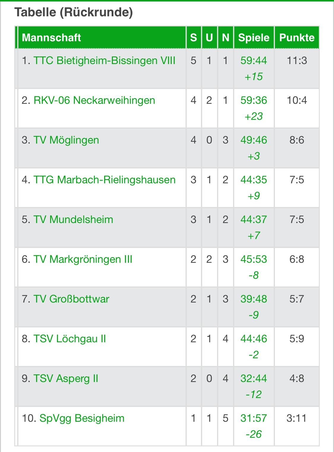 Mit diesem klaren Sieg von 9:4 gegen Besigheim eroberte man in der Rückrunden Tabelle mit einer Punkteausbeute von 11:3 den ersten Platz.