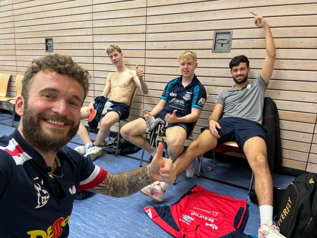In der Besetzung David Steinle, Abdelbasset Chaichi, Lasse Mähnert und Tom Colvin machte man sich auf die Reise ins ländliche Hohenlohe. Dort angekommen, siegte man zunächst glatt mit 4:0 Spielen gegen den Gastgeber vom SC Buchenbach. Dabei galt es sowohl im Einzel von Lasse gegen Martin Rapp als auch im Doppel von Chaichi und Tom gegen Ben Böger/Theo Rüdinger durchaus kritische Situationen zu meistern, ehe die Siege eingetütet waren.