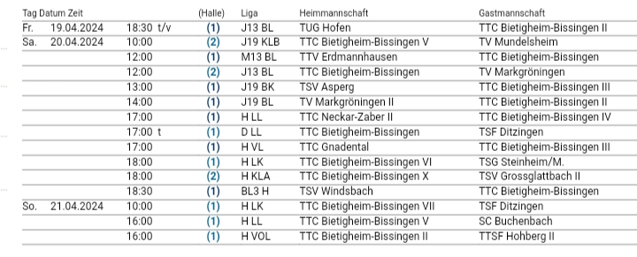 15 Teams des TTC’s sind hier nochmals im Einsatz, darunter sechs Jugend- und neun Herren-/Damen-Mannschaften.
